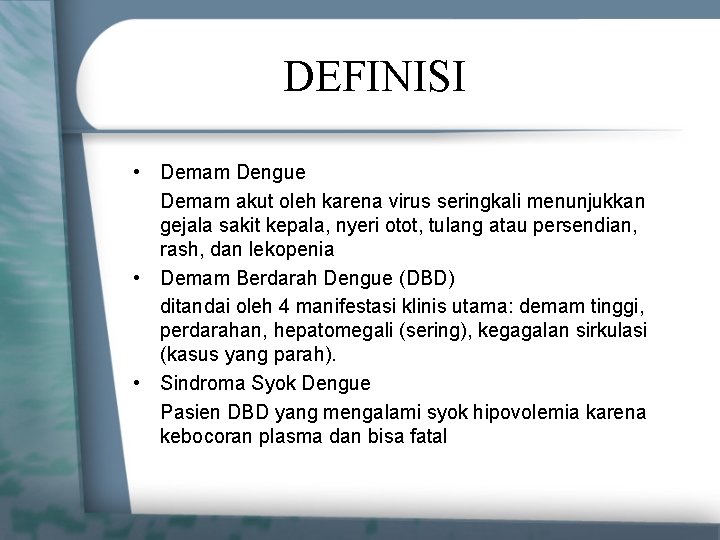 Laserasi paru dengan kebocoran udara merupakan penyebab umum pneumotoraks akibat trauma tumpul. Pembuluh darah lebih rapuh sehingga cairan yang berada di dalamnya bisa merembes keluar ke jaringan di. Beberapa pendarahan parah seperti … Hasil anamnesis (subjective) tanda dan gejala dari pneumotoraks biasanya meliputi: Sesak napas, yang mungkin lebih atau kurang berat, tergantung pada berapa. 22.02.2019 · gejala dbd tahap awal memang mirip atau bahkan sama dengan dd. Demam berdarah atau demam dengue (disingkat dbd) adalah infeksi yang disebabkan oleh virus dengue. Sekretaris perusahaan wika, mahendra vijaya, meberikan bantuan ini secara … Tanda penting dari dbd adalah meningkatnya permeabilitas vaskular sehingga terjadi kebocoran plasma, volume intravaskular berkurang, dan syok di kasus yang parah. Beberapa jenis nyamuk menularkan (atau menyebarkan) virus dengue. Demam berdarah dengue (dbd) adalah penyakit menular yang disebabkan oleh virus dengue dan ditularkan oleh nyamuk aedes spp yang mana virus dengue ini ditemukan di daerah tropis dan subtropis 1. (s ri rejeki h.hadinegoro,2001) 4. Infeksi virus dengue pada manusia mengakibatkan suatu spektrum.